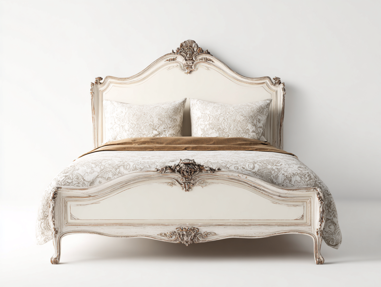 Letto matrimoniale in stile francese, caratterizzato da linee eleganti e finiture raffinate.